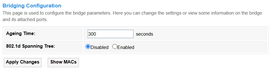 Show MACs: Click to view the Bridge Forwarding Database with information about Port, MAC Address, Local, Ageing Timer.