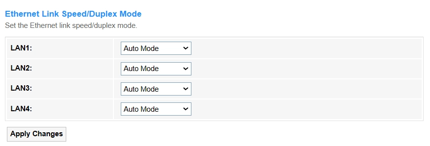 Set the Ethernet Link Speed/Duplex Mode to ensure stable and efficient communication by matching the data rate (e.g.,10/100/1000 Mbps) and transmission direction, both way simultaneously (Full Duplex) or alternately (Half Duplex), between connected devices. Proper settings prevent performance issues like packet loss or speed degradation caused by mismatched parameters.