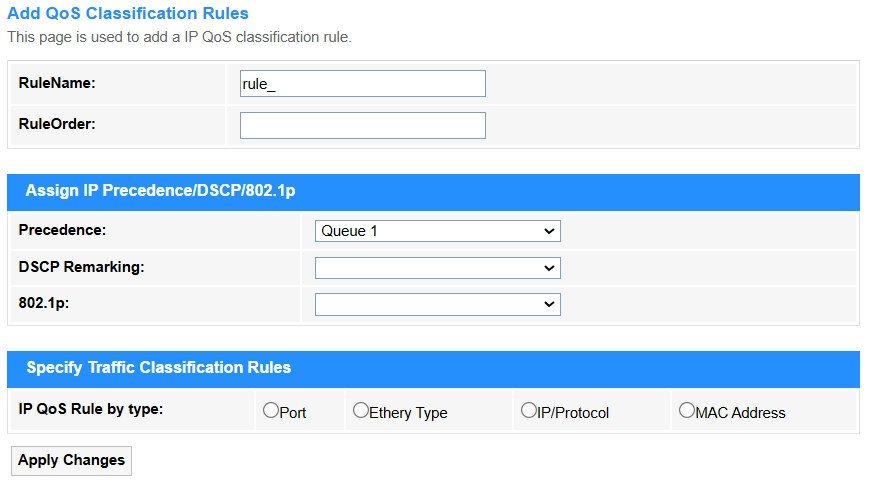 - If select Policy WRR, enter the weight number (default is 40:30:20:10) for the queue and Enable Enable behind it.