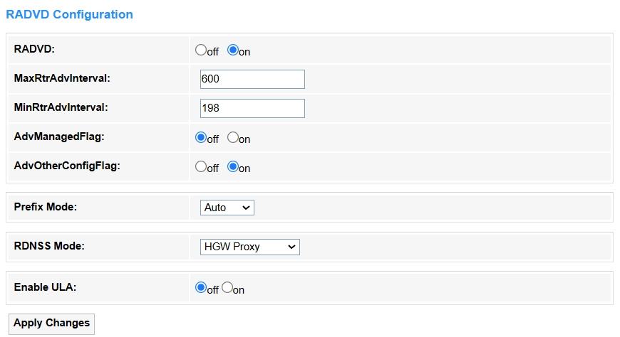 RADVD: Select On to configure Prefix Mode and ULA. Otherwise select Off.