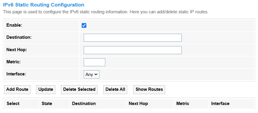 Add Route: Click to add the route configured above into the IPv6 Static Route Table.