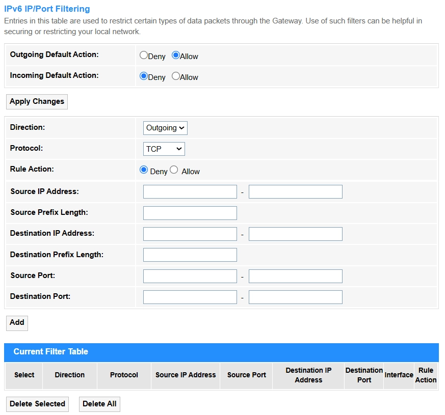 Source/Destination IP: Enter the full IPv6 address (e.g., 2001:db8::1 for a single device). Or use :: to shorten long strings of zeros (e.g., 2001:0db8::1 → 2001:db8::1).