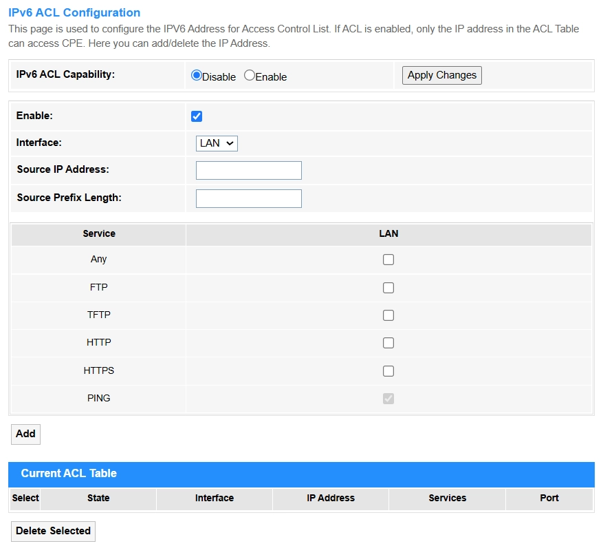 IPv6 ACL Capability: Select Enable when you need granular traffic control (e.g., security filtering); select Disable if no traffic restrictions are required to reduce device processing overhead.