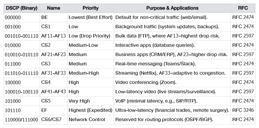 - DSCP Pattern: Matches packets with specific DSCP tags (e.g., EF for VoIP).