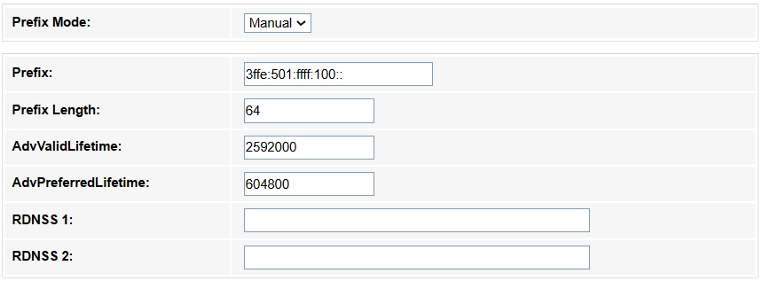 ② Manual: Prefixes are statically configured and advertised without SLAAC. Address assignment relies on DHCPv6 or manual input. For example, in controlled environments where specific prefixes must be enforced.