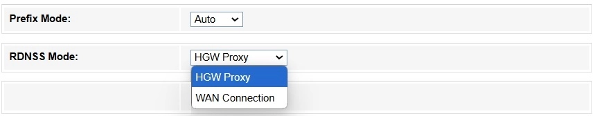 - RDNSS Mode: Select HGW Proxy to manually configure DNS (e.g., custom servers like Cloudflare) and force devices to route DNS queries through the gateway; select WAN Connection Mode to automatically advertise the ISP's default DNS servers obtained from the WAN interface (e.g., via PPPoE/DHCPv6).