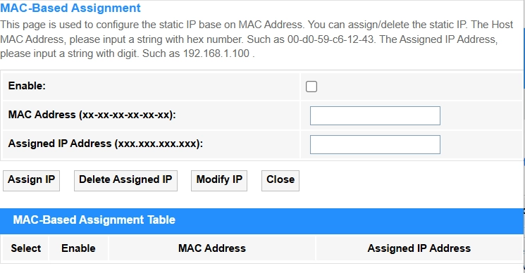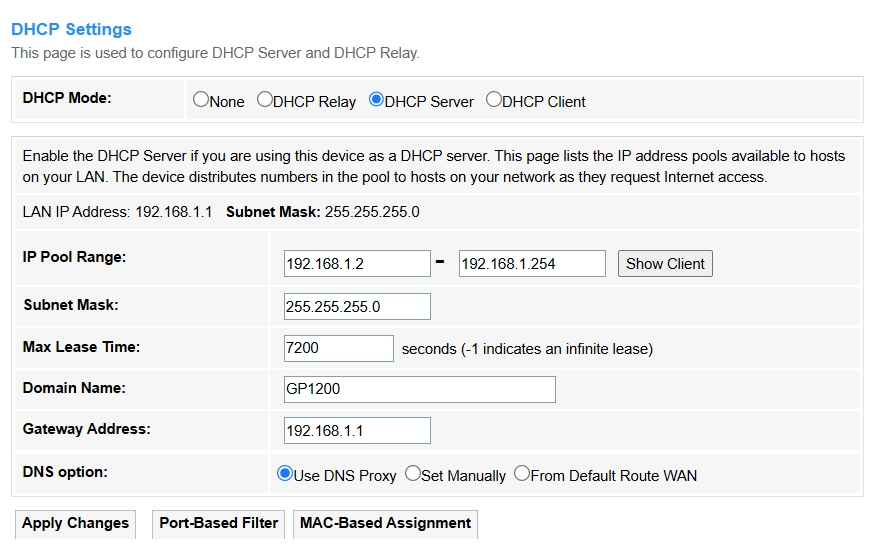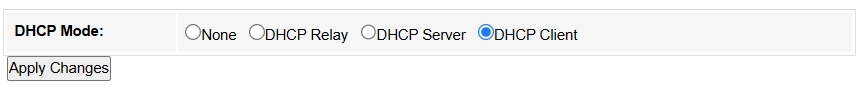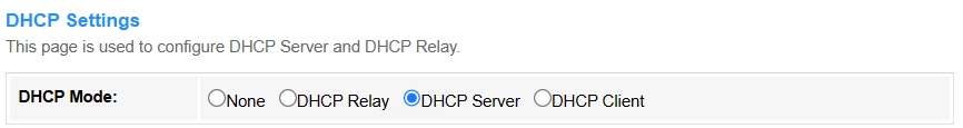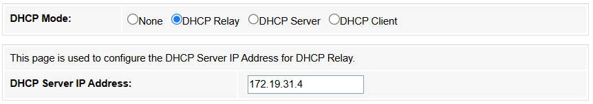 DHCP Relay: The router forwards DHCP requests across subnets/VLANs (enterprise use, e.g., centralizing DHCP in a data center). Enter the DHCP Server IP address, or keep it default.