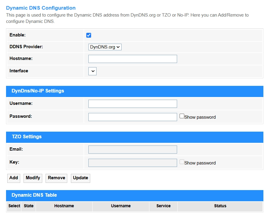 - Update: Click to update the Dynamic DNS Table.