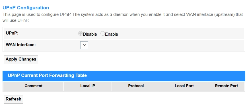Refresh: Click to update the UPnP Current Port Forwarding Table.