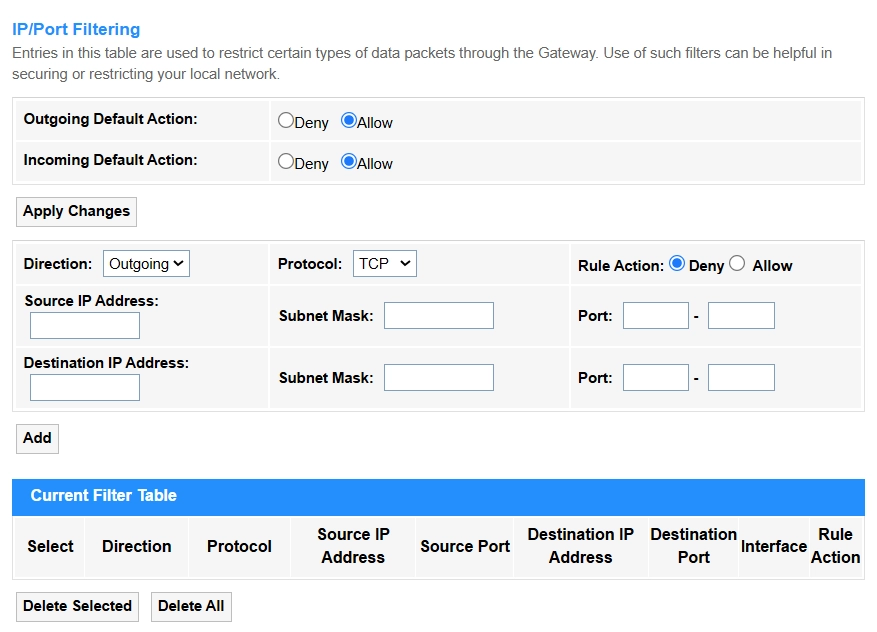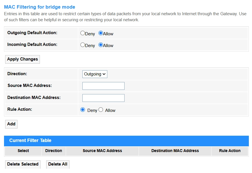 Add: Click to add the MAC filtering rule configured above into the Current Filter Table.