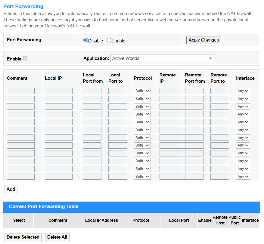 Add: Click to add the Port Forwarding rule configured above into the Current Port Forwarding Table.