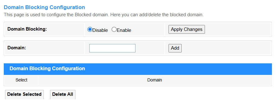 Add: Click to add the newly-configured Domain blocking rule into the Domain blocking Table.
