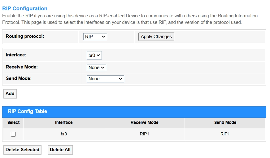 Send Mode: Select to define RIP version for outgoing updates (None/RIP1/RIP2/RIP1COMPAT).