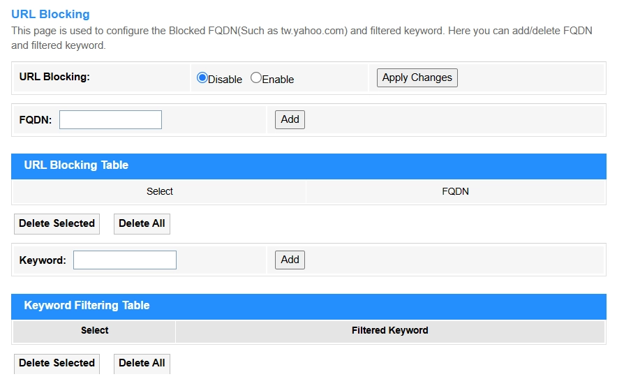 • Add: Click to add the URL blocking rule configured above into the URL Blocking Table or Keyword Filtering Table.