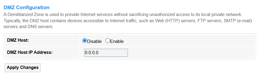 • DMZ Host IP Address: Enter the internal device's IP (e.g., 192.168.1.100) that will be fully exposed to the internet when DMZ is enabled.