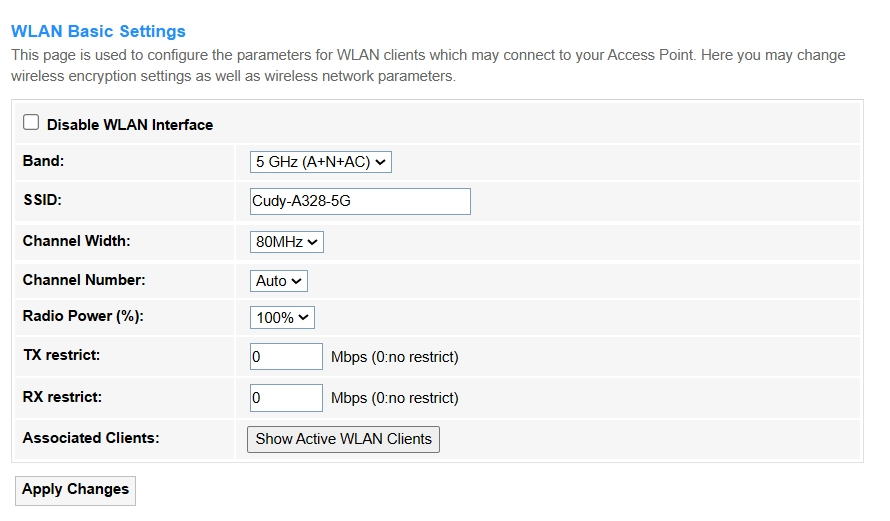 Disable WLAN Interface: Once Enabled, all the relevant WLAN settings, like Band, SSID, WLAN Clients, Security, Access Control, Site survey, WPS will be locked and unable to configure.
