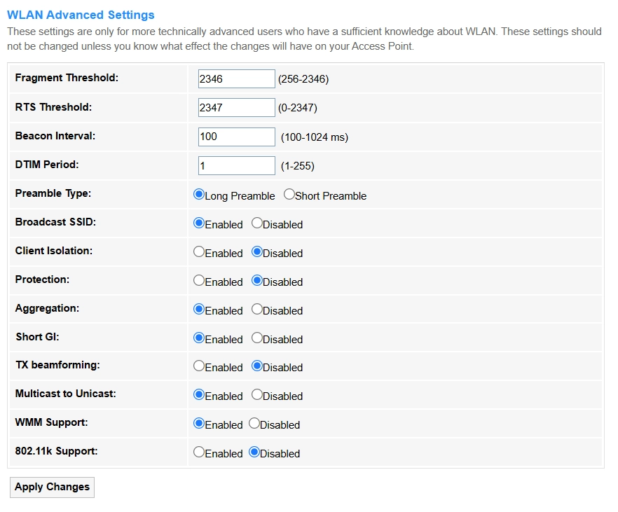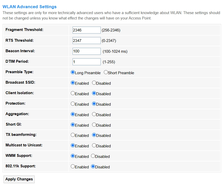 - RTS Threshold: Minimum packet size to trigger RTS/CTS handshake in order to reduce collisions, ranging from 0-2347. Keep it as default unless necessary.