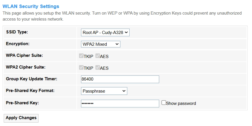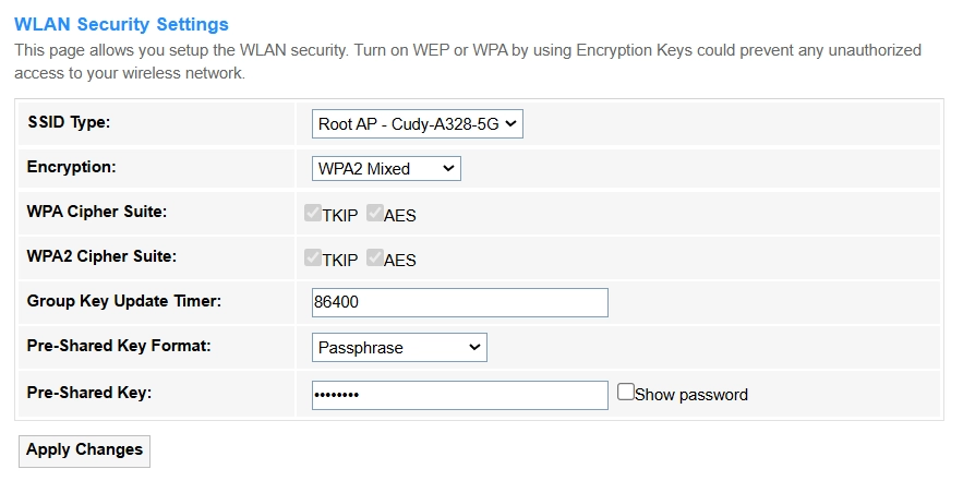 - WPA2 Mixed: Supports both WPA2 (AES) and legacy WPA (TKIP) for compatibility. Keep WPA Cipher Suite/WPA2 Cipher Suite/Group Key Update Timer as default, and configure the Pre-Shared Key Format and Pre-Shared Key as desired.