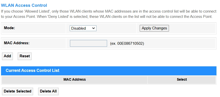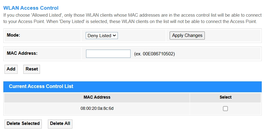 - Deny Listed: Only those WLAN clients whose MAC addresses are in the access control list will not be able to connect to your Access Point.