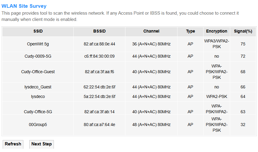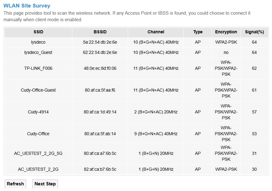 The list will display these network's SSID/BSSID/Wireless Channel opened/Network Type/Encryption/Signal Strength. You may choose to connect the target network manually when client mode is enabled.