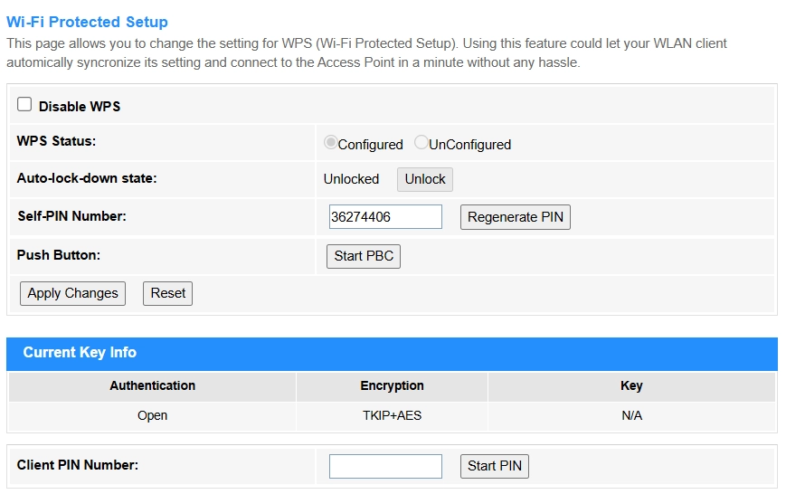 - Push Button: Click this virtual button Start PBC to quickly and easily start the WPS process. Then you have to run WPS in the client(s) within 2 minutes.