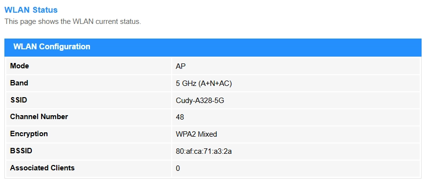 This page will display the current 5G WLAN Status, including Mode, Band, SSID, Channel Number, Encryption, BSSID and Associated Clients.