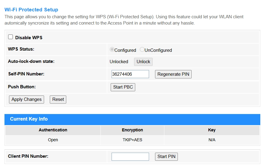 - Self-PIN Number: Displays the current PIN number (an 8-digit numeric code used to securely connect devices to a Wi-Fi network via the Wi-Fi Protected Setup protocol).