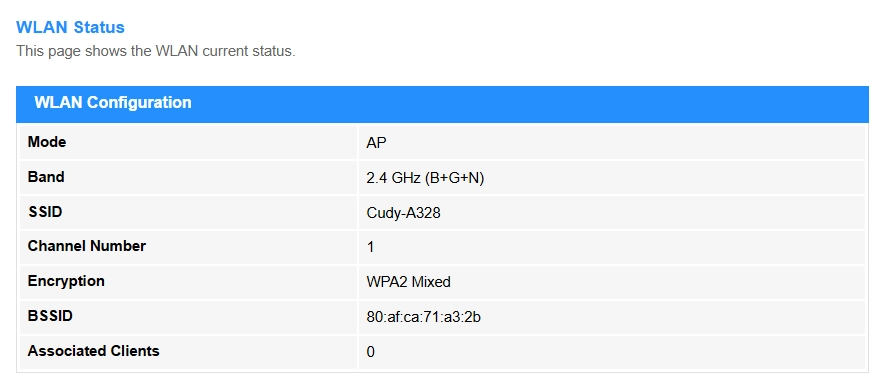 This page will display the current 2.4G WLAN Status, including Mode, Band, SSID, Channel Number, Encryption, BSSID and Associated Clients.