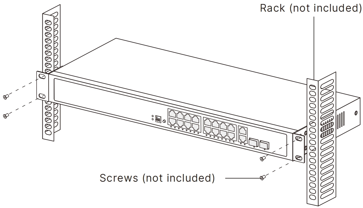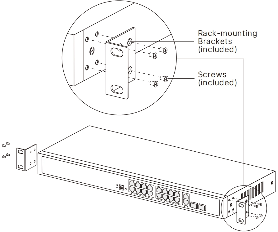 Secure the rack-mounting brackets to the Switch with screws, as illustrated below.