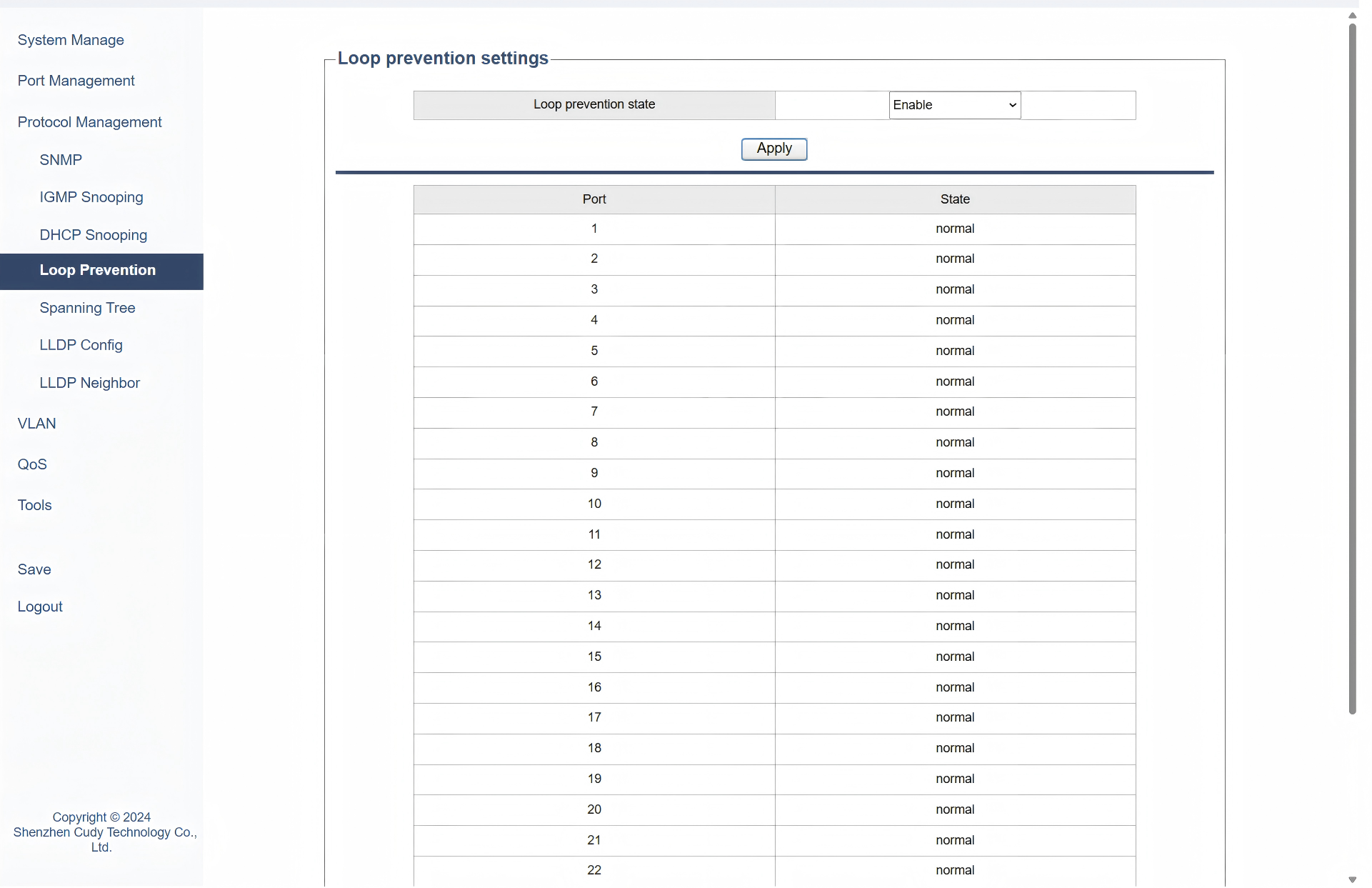 Loop prevention state: Select to Enable or Disable Loop Prevention. Enable it to avoid network loops and potential broadcast storms; Disable it when necessary in specific controlled environments where loops are managed differently.