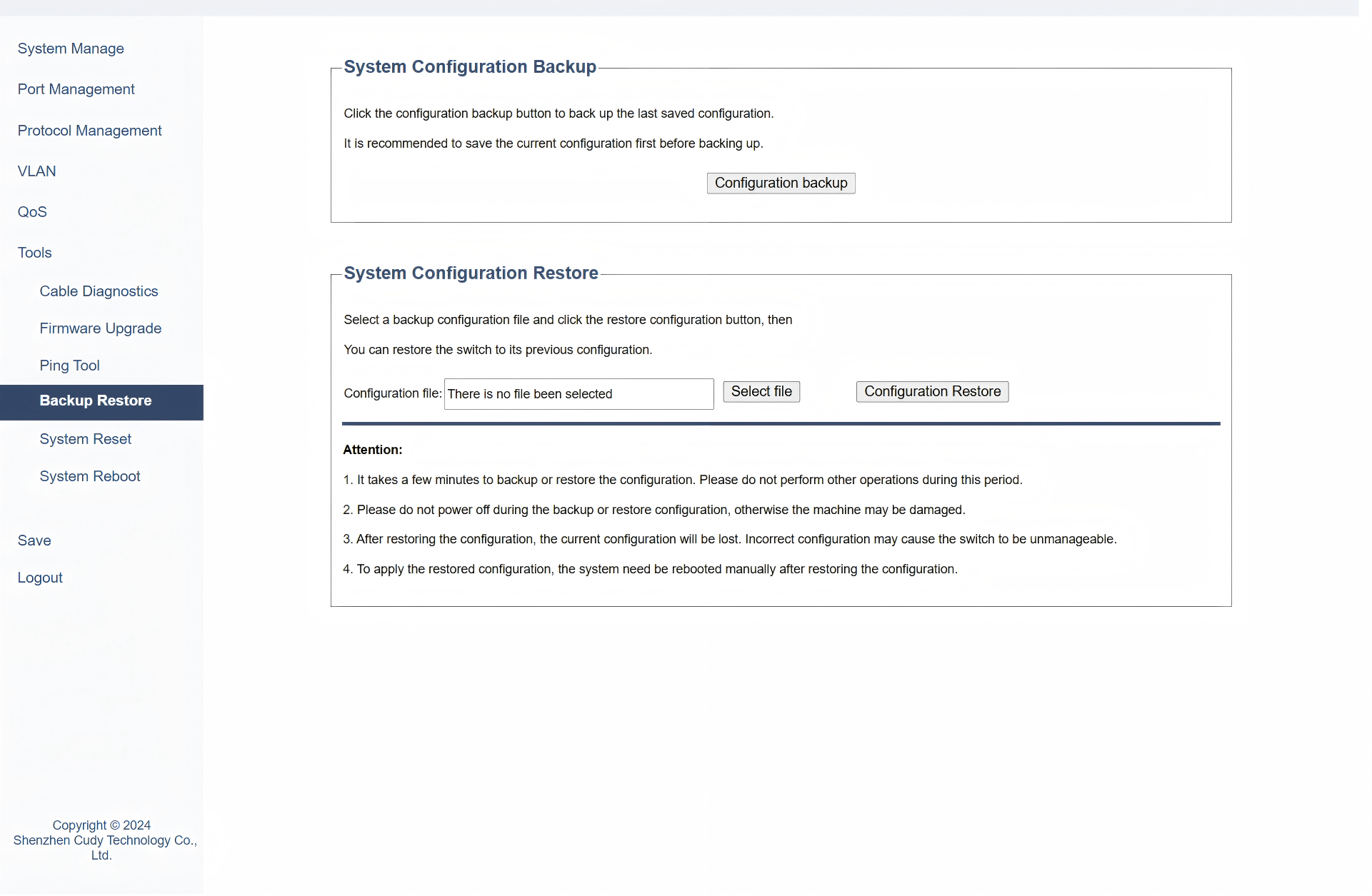 On the Tools >> Backup Restore page, you can save or retrieve switch configuration settings, allowing you to back up current settings or restore previous ones.