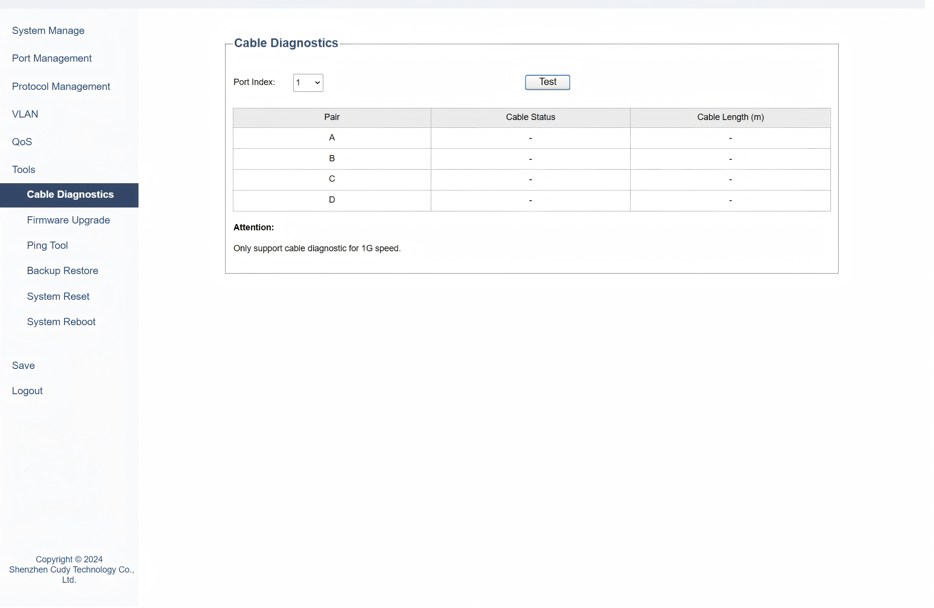 On the Tools >> Cable Diagnostics page, you can test and assess the condition of the cables connected to specific ports. Please follow the steps: