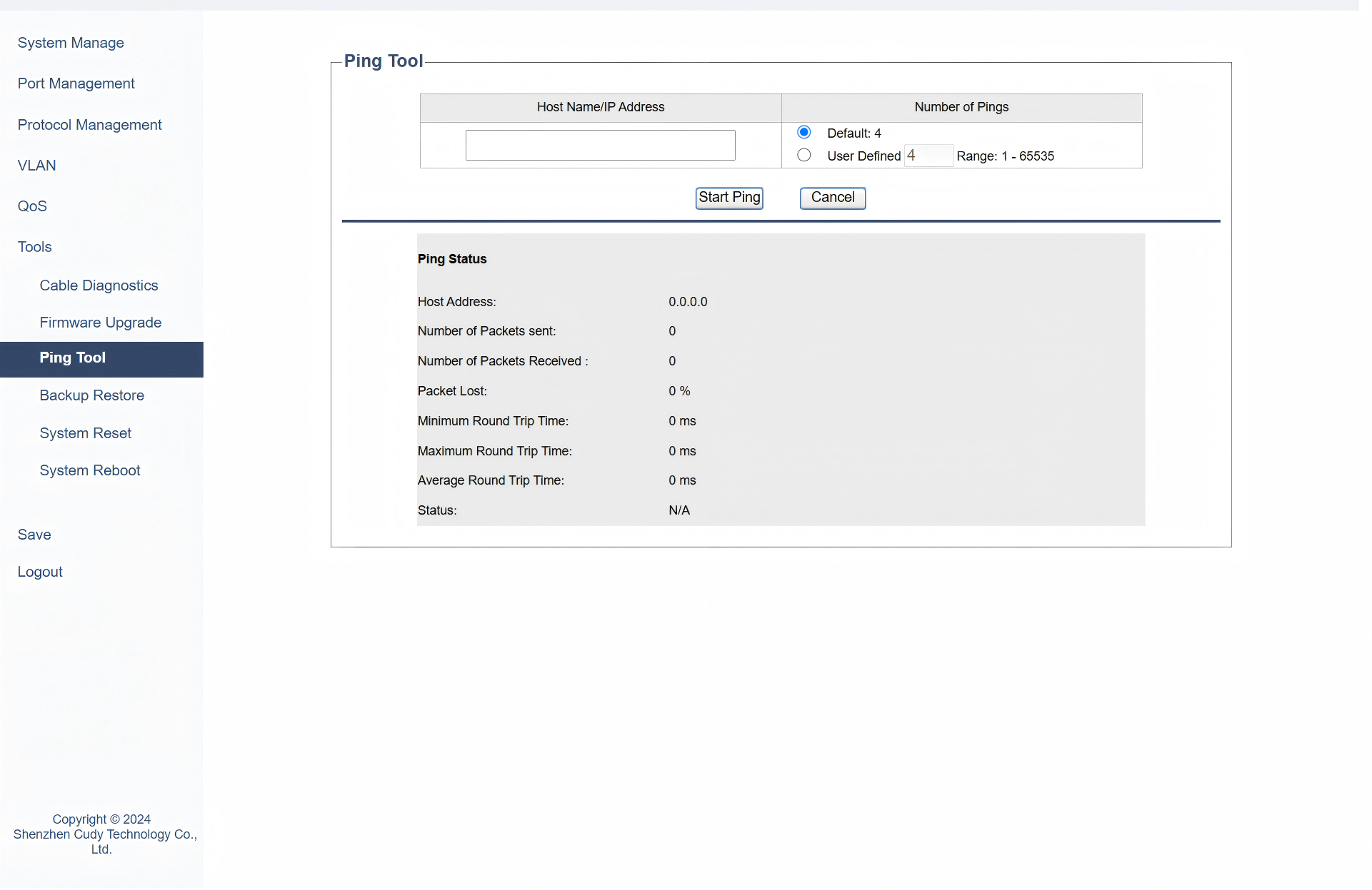 On the Tools >> Ping Tool page, you can test connectivity to another device by sending ICMP echo requests and measuring the response time. Please follow the steps: