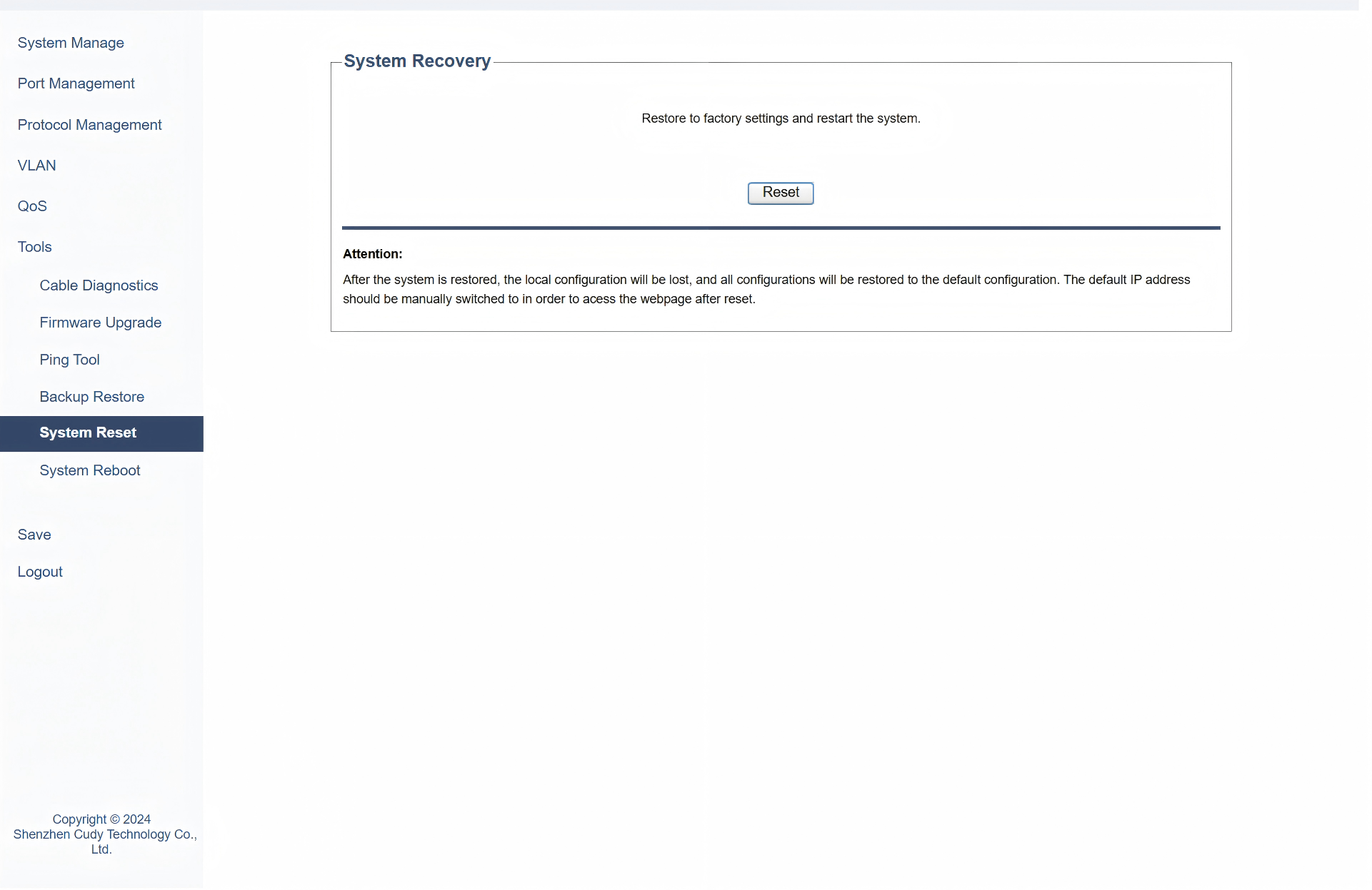 On the Tools >> System Reset page, you can reset the switch to its factory default settings, erasing all custom configurations.