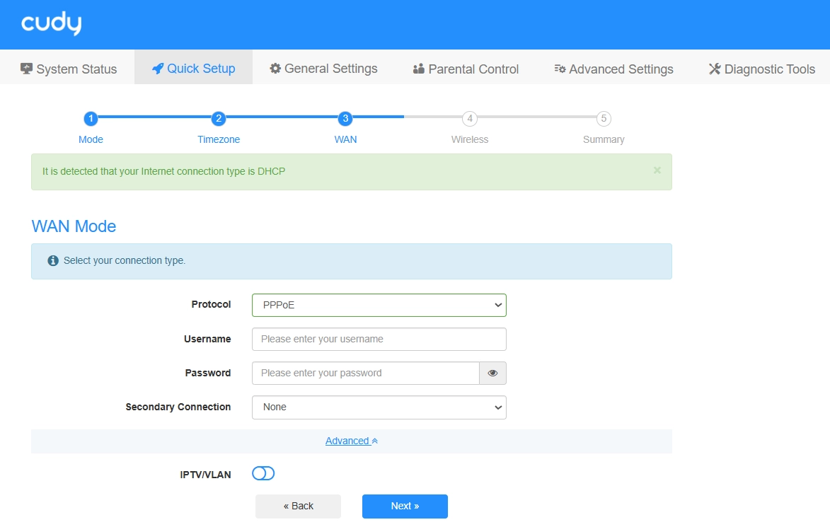 WAN Mode will be auto-detected (or you may select from the Protocol list accordingly), and then enter the corresponding parameters.
