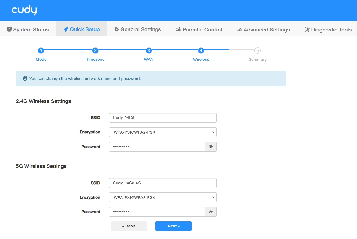 Customize your 2.4G/5G wireless network name (SSID) and password.