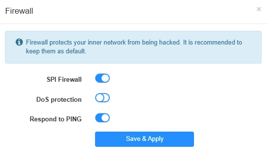 is a security system that monitors and controls incoming and outgoing network traffic based on predetermined security rules. It serves as a barrier between a trusted internal network and untrusted external networks, such as the Internet. This function is enabled by default. It is highly recommended to keep the default settings.