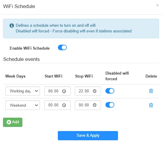 You may Modify/Delete/Add the entries. To specify the schedule, you need to set the Week Days, Start WiFi and Stop WiFi time. Enable Disabled wifi forced to force WiFi to shut off even if stations are associated.