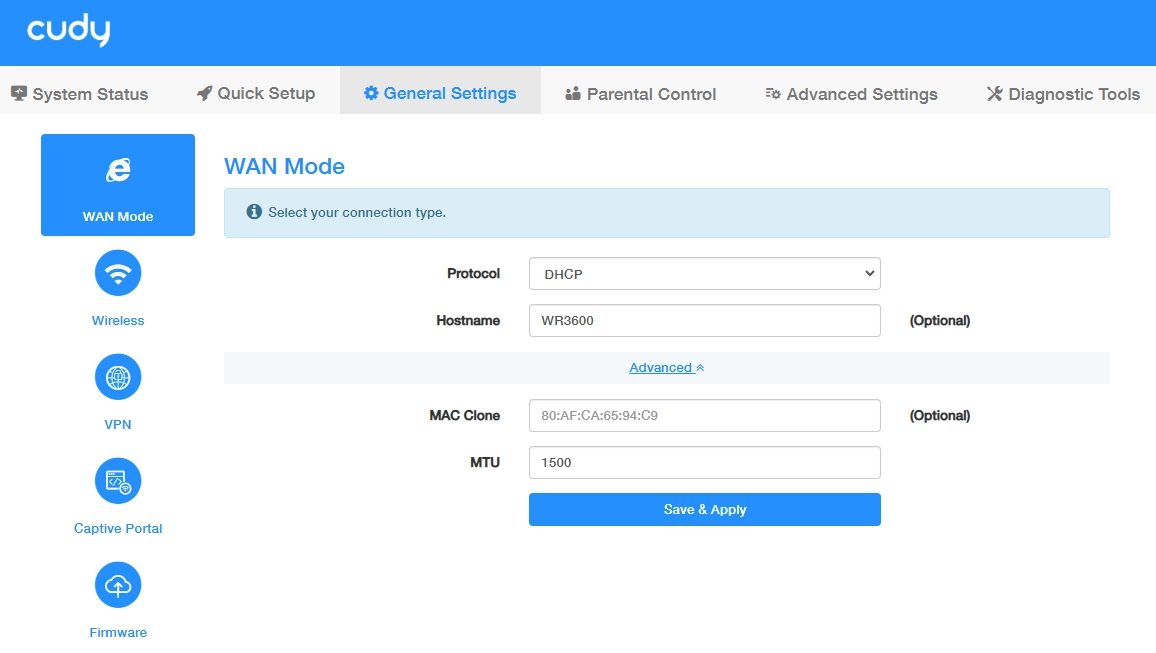 If you choose DHCP, keep MTU as default unless your ISP provides differently. The Host name and MAC address Clone are optional. Then Save & Apply your configurations.
