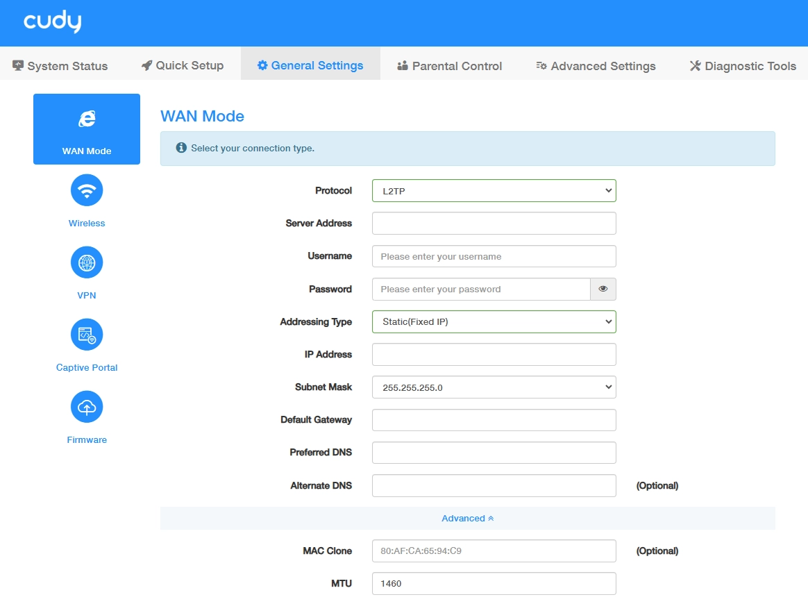 If you choose L2TP, enter parameters for Server Address/Username/Password. And then select Addressing Type provided by your ISP, and configure the required parameters. Keep MTU as default unless your ISP provides differently. Then Save & Apply your configurations.