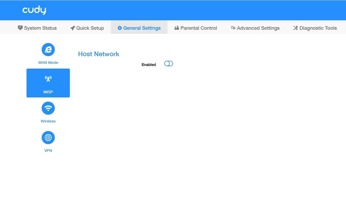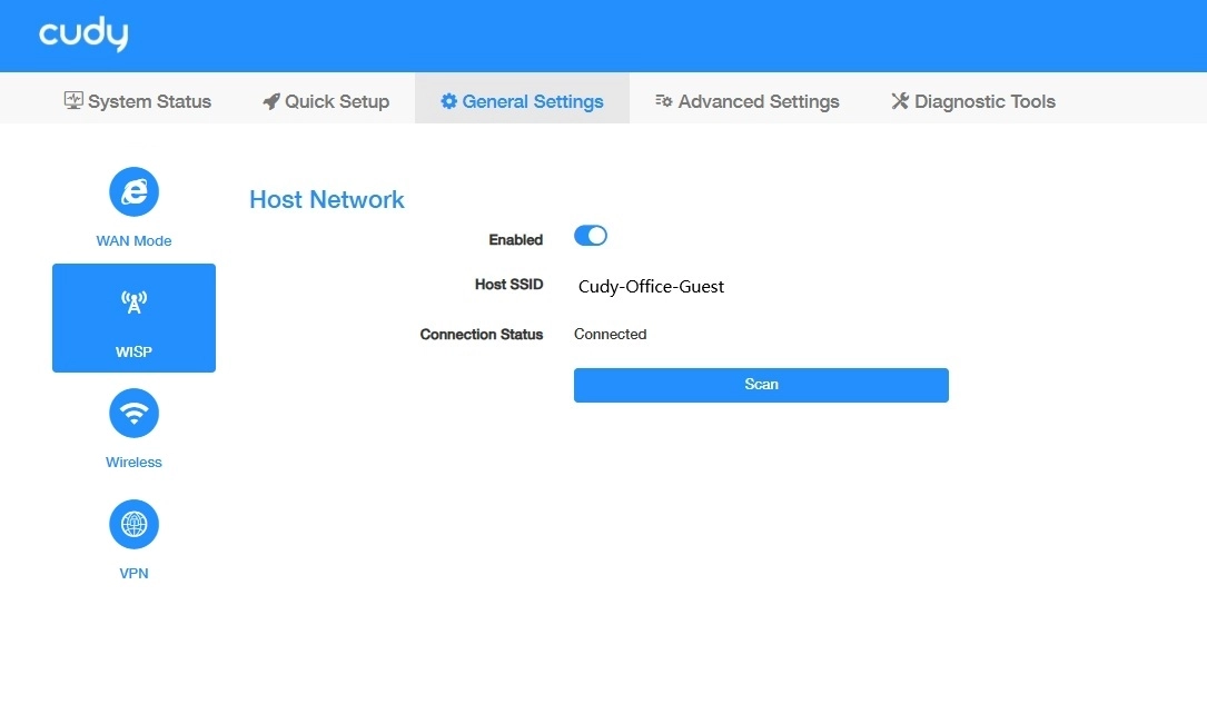 On the General Settings >> WISP page, you can enable the router to wirelessly connect to a distant Wi-Fi network and share that connection locally via Ethernet/Wi-Fi, acting as a client bridge. Please follow the steps below.