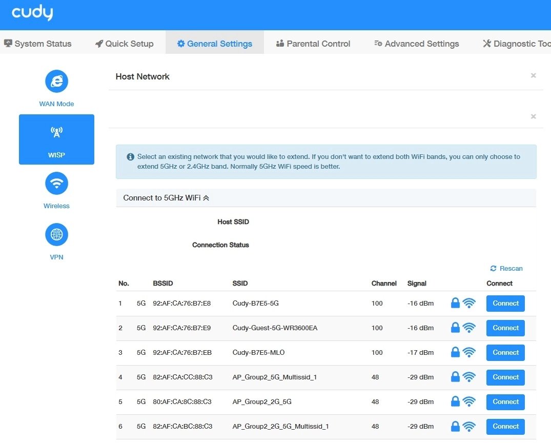 Determine 5GHz or 2.4GHz WiFi network you want to connect to. And then click Scan to search for available Wi-Fi networks. If necessary, click Rescan to re-search or update the host network list.
