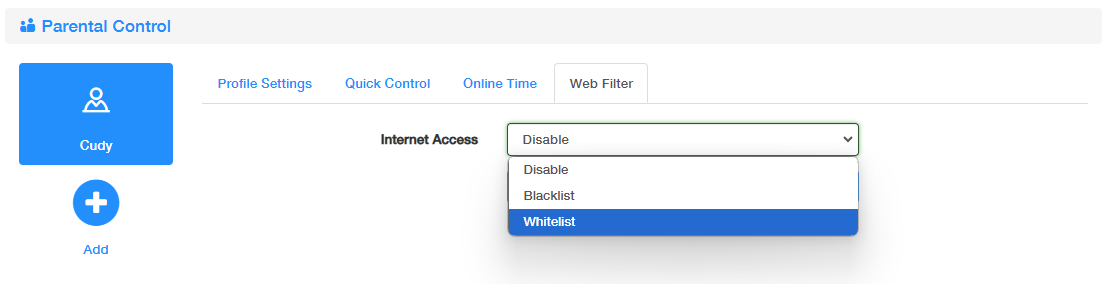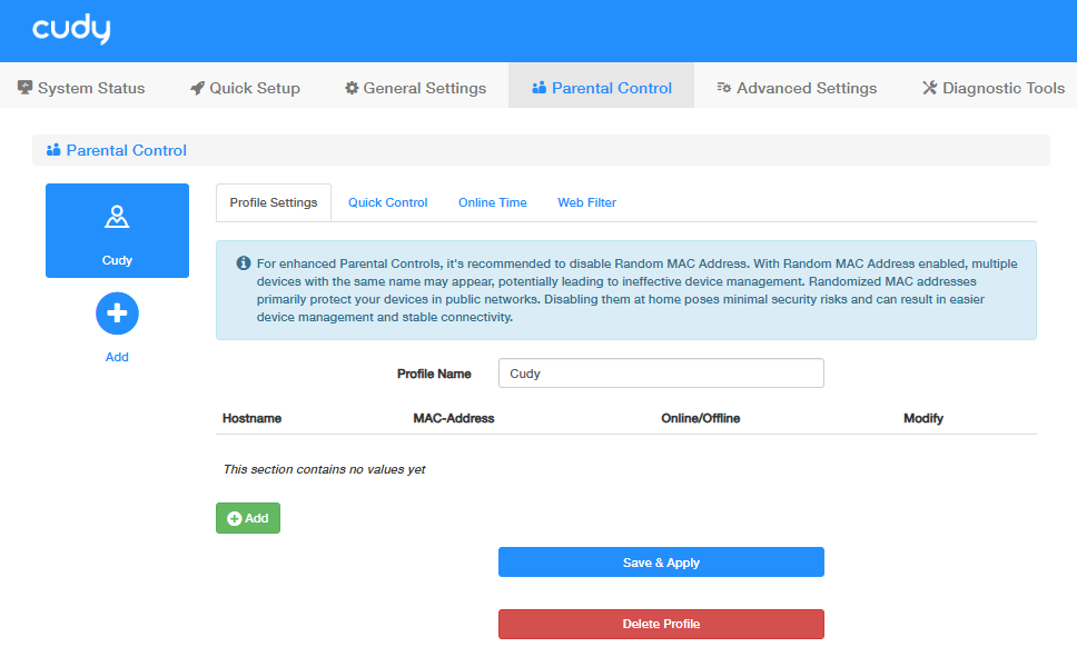 - Click Add, set a profile name, click Save & Apply to create a profile for a family member.