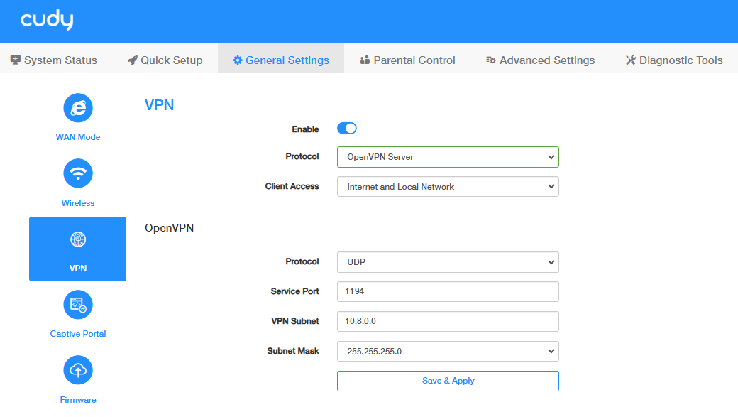 - Go to General Settings ->VPN. Enable VPN, and select OpenVPN Server as Protocol.
