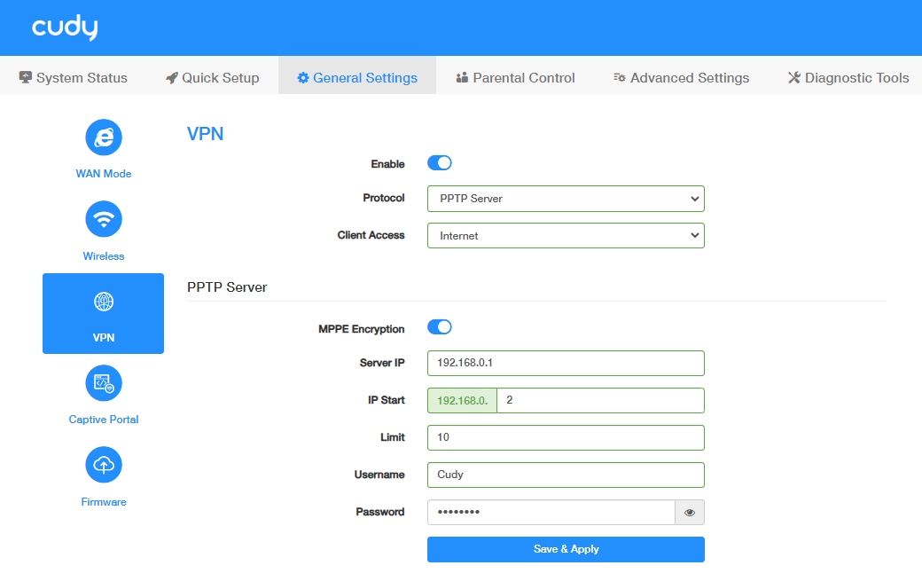 - Go to General Settings ->VPN. Enable VPN, and select PPTP Server as Protocol.