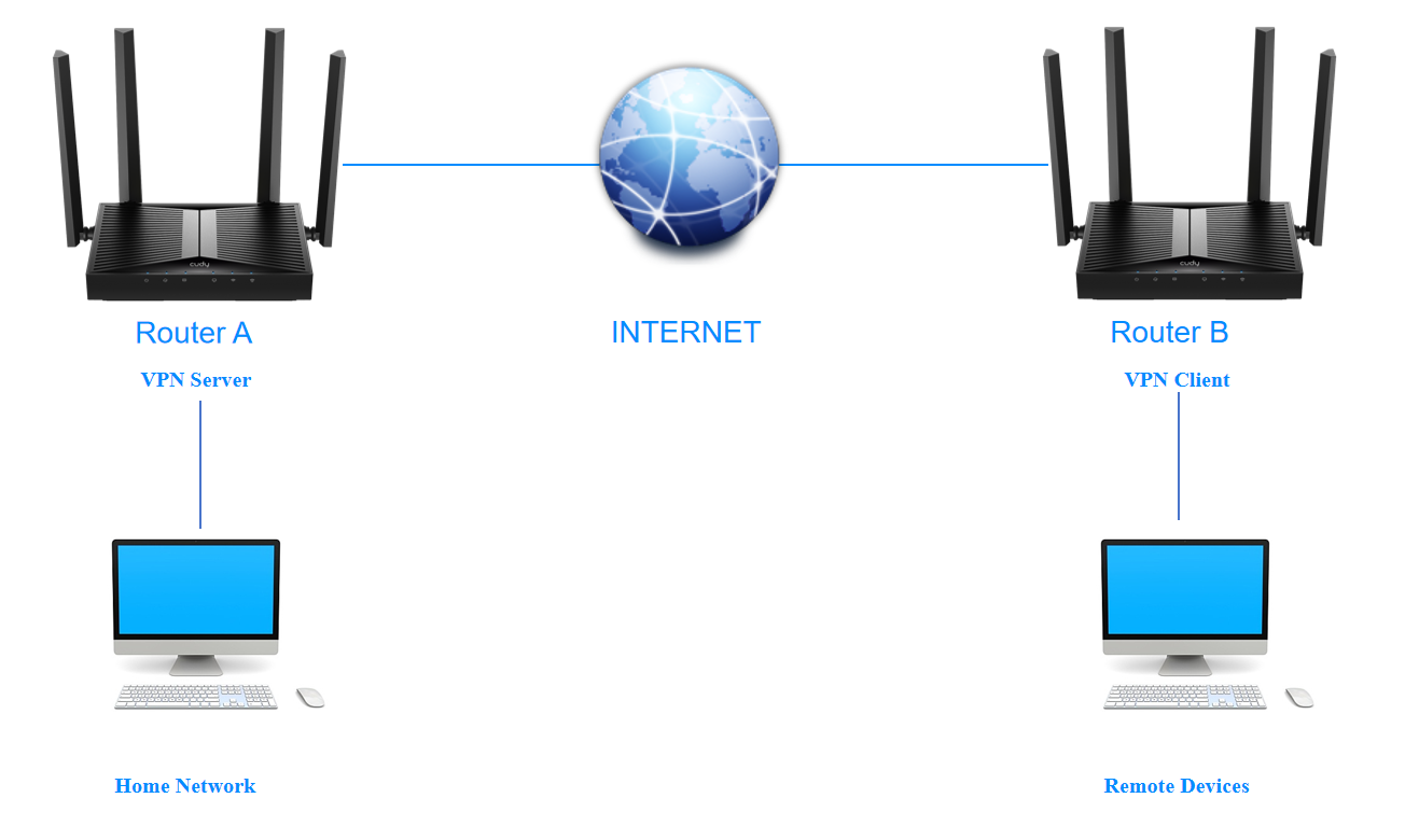VPN (Virtual Private Network) helps you access Internet resources remotely, securely, and privately through tunneling technology. When you access the Internet, VPN encrypts your personal information and hides your IP address from the public. For VPN users, it looks like the devices are directly connected. Cudy Router supports 6 types of VPN connections: PPTP, L2TP, OpenVPN, WireGuard, ZeroTier, IPSec (site-to-site). Please choose an appropriate VPN according to your needs and circumstances.