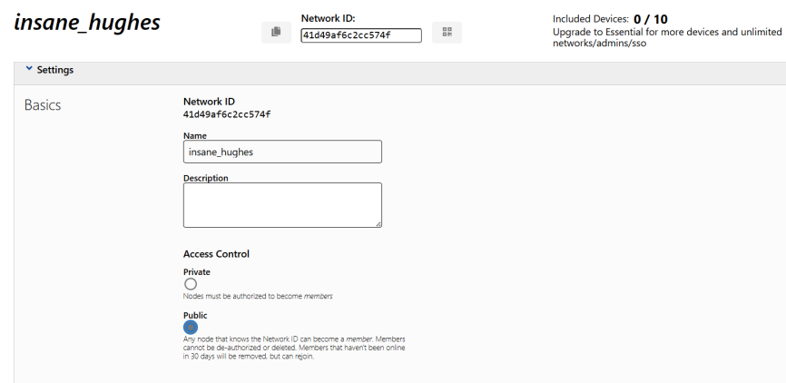 Zerotier will create a new network and assign a NETWORK ID for you. Then click on the assigned NETWORK ID, and its setting page will display.